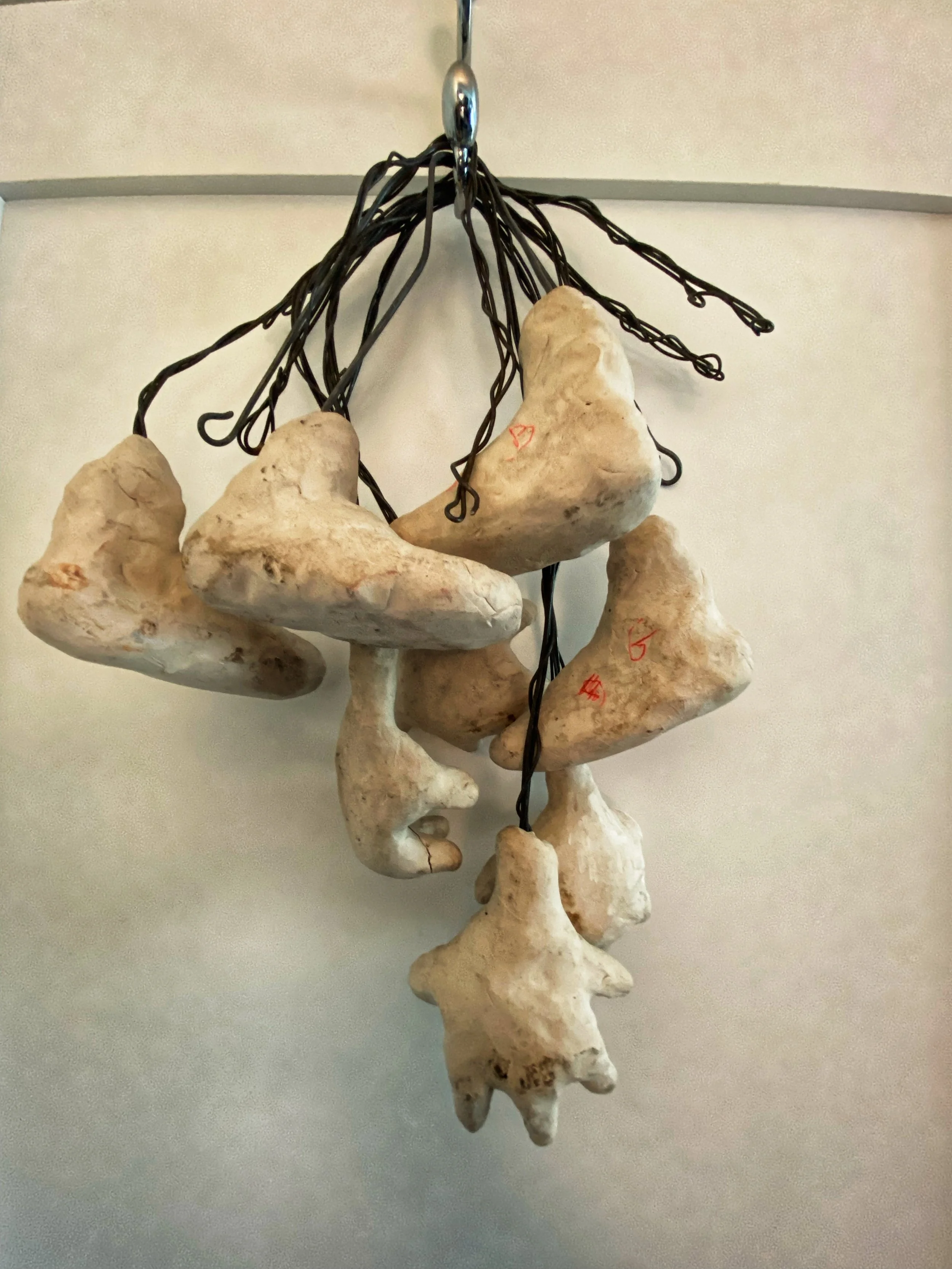 I hunted for the notes from my UCLA instructor and classmates in that ten-year-old workshop in my parents’ garage in the dusty plastic tubs with my childhood memorabilia, photo albums, and cases of CDs—yes, I saved those. Here’s what I found instead: two sets of small Sculpey clay hands and feet molded onto gnarled wire hangers my grandmother used to build unique, standing sculptures of Santa Claus at Christmastime. My cousin and I retrieved the creepy extremities—the last remnants of Granny’s unfinished art—hanging in “the cold room” in my grandparents’ empty house after the four-day estate sale before the house sold. They were the only items that didn’t sell. It’s no shock why.